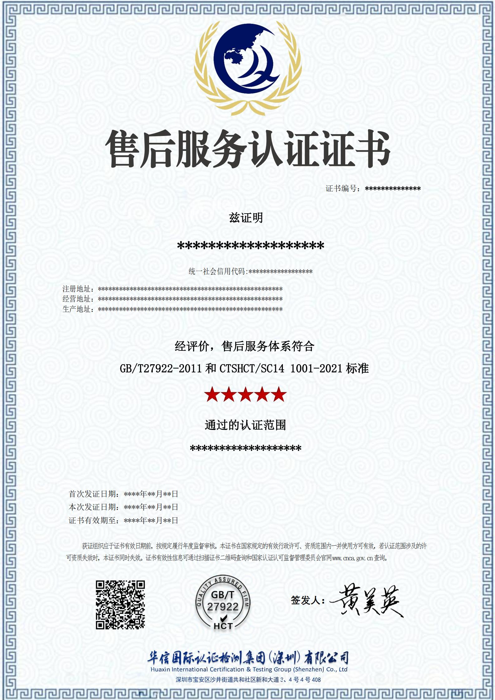 售后服务认证证书