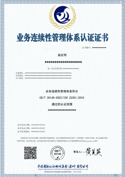 业务连续性管理体系认证证书