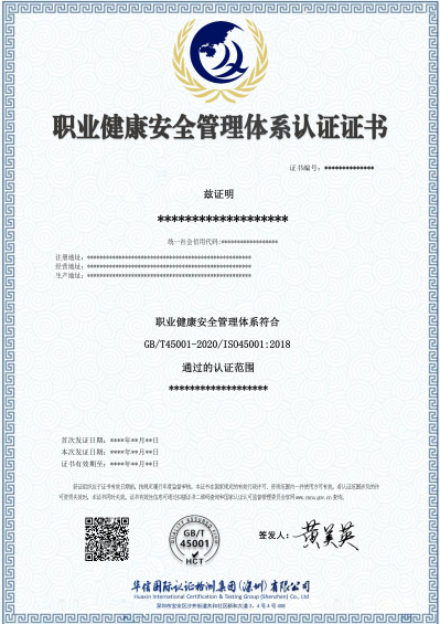 职业健康安全管理体系认证证书